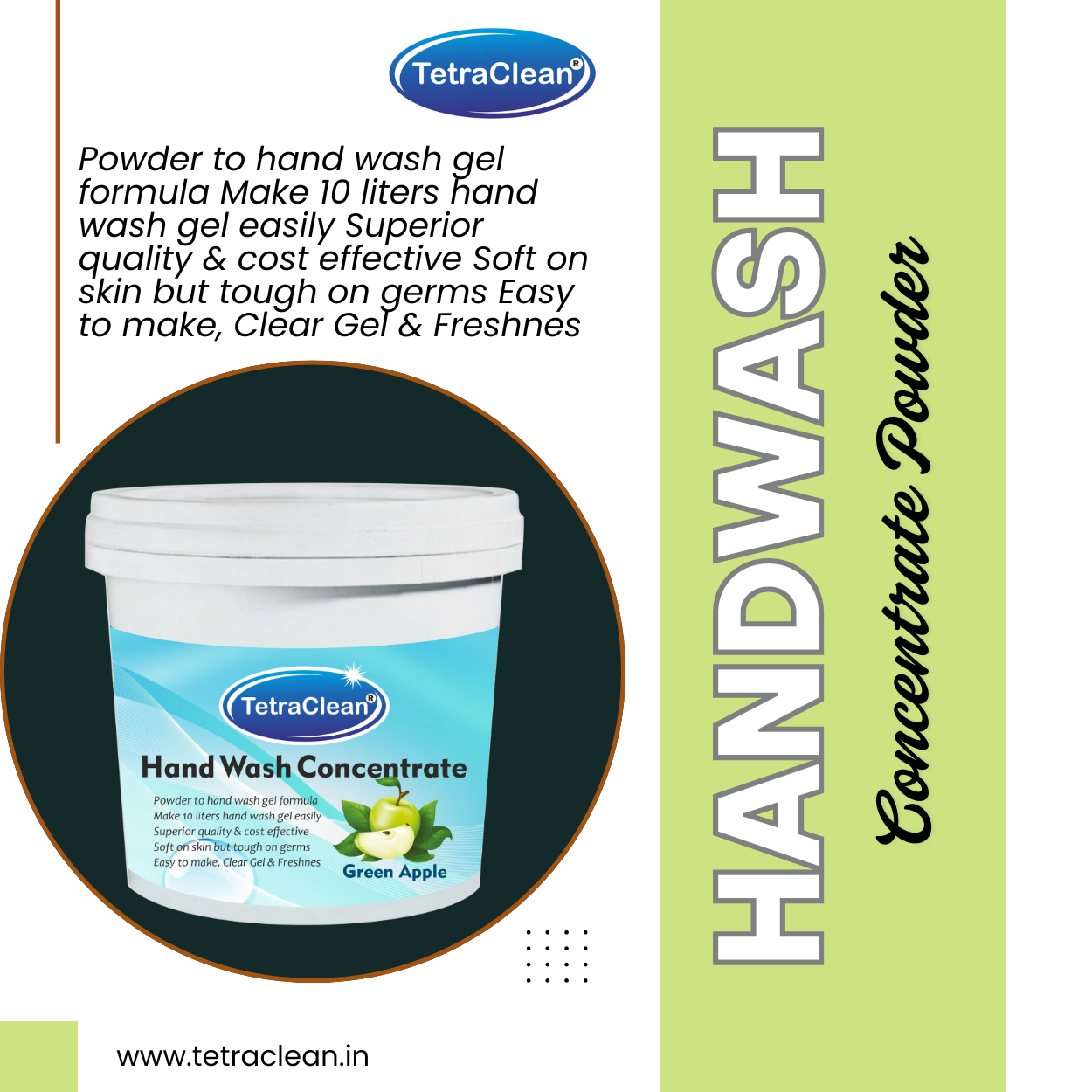 TetraClean Green Apple Hand Wash Concentrate Powder turns into a crystal-clear, green apple–fragranced gel hand wash that prepares up to 10 litres from a single pack, making it ideal for homes, offices, schools, shops, and dispenser refills. Just mix the recommended 50 grams of powder in water, stir, let it rest, and your thick, premium-looking gel is ready to pour into any pump or foaming bottle.