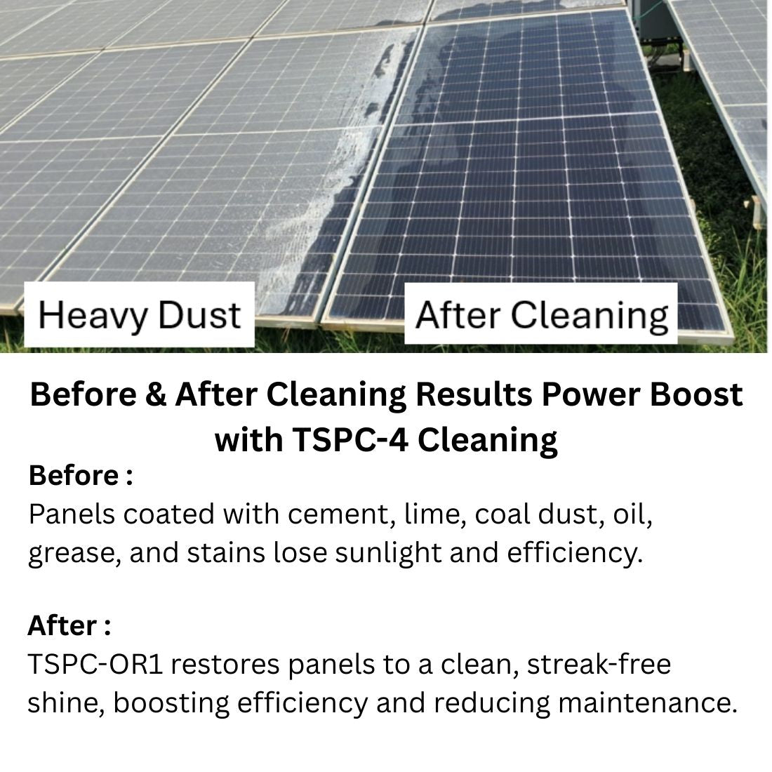 TetraClean TSPC‑OR1 is an organic heavy‑duty solar panel cleaner formulated to remove cement dust, lime dust, coal dust, carbon dust, chimney deposits, oil, grease, hard water stains, bird droppings and other heavy industrial pollutants from solar panels. It is safe for all panel types and is ideal for plants near cement industries, refineries, mining areas and other heavy‑pollution zones where thick deposits block sunlight and reduce power generation.